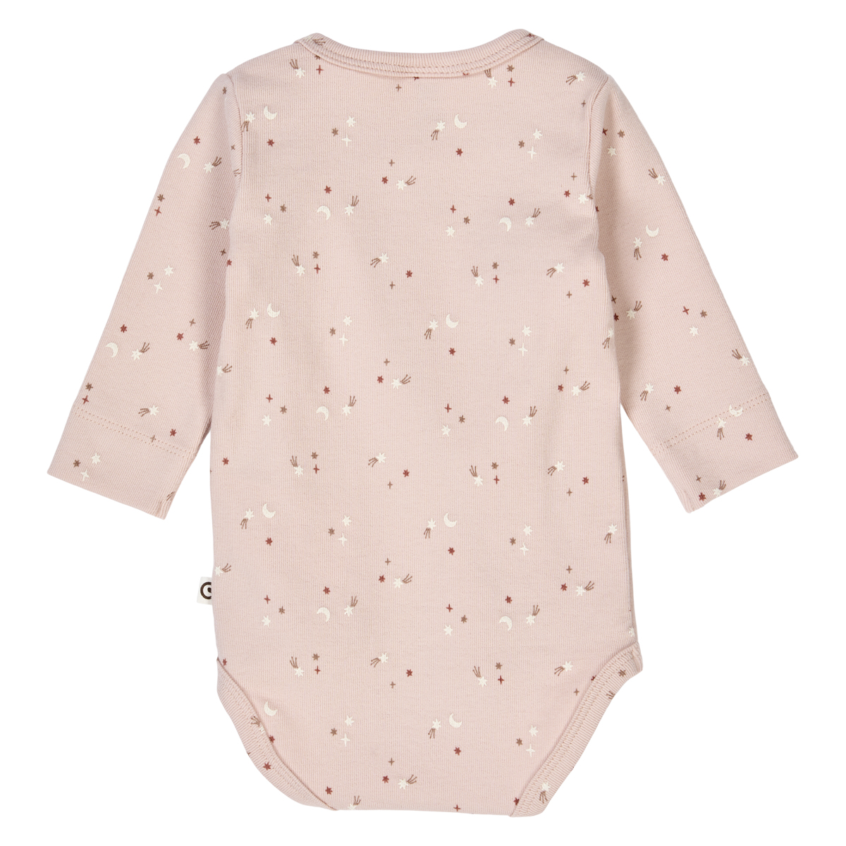 Het shirt heeft lange mouwen en een praktische opening (bij de hals of schouder, afhankelijk van jouw model), zodat je het gemakkelijk aan- en uittrekt zonder je pasgeboren baby onnodig te hoeven optillen. De voetlegging met geïntegreerde voetjes voorkomt blote voetjes en sokjes die steeds uitvallen, wat extra comfortabel is voor pasgeborenen die hun lichaamstemperatuur nog niet goed kunnen reguleren. De pasvorm is afgestemd op maat Newborn, waardoor het setje mooi aansluit zonder te knellen en voldoende bewegingsvrijheid biedt.