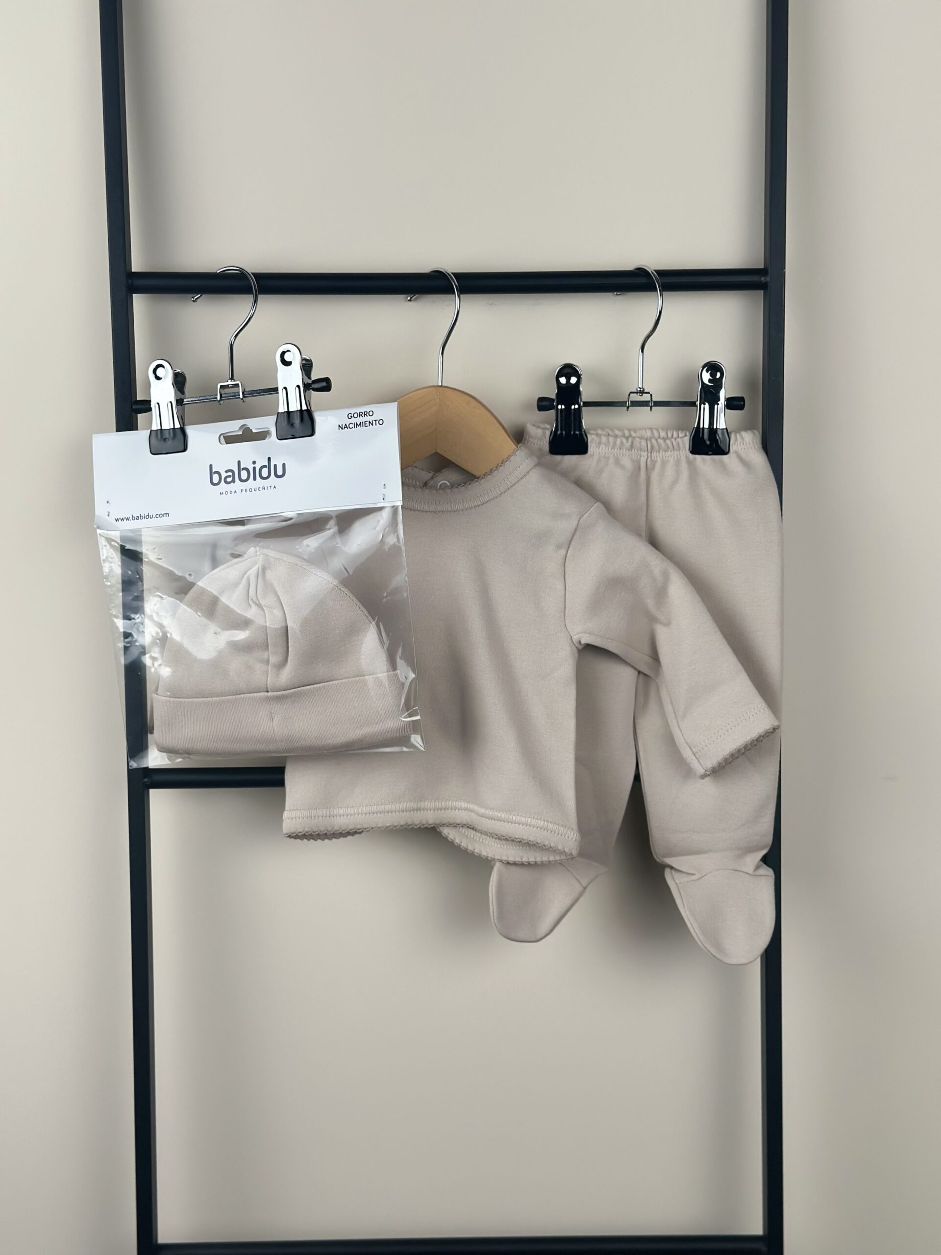 Dit lieve Babidu newborn setje in een warme beige tint is speciaal ontworpen voor de allereerste weken van je baby. Het tweedelige pakje bestaat uit een comfortabel longsleeve shirt en een bijpassende voetlegging, zodat je kleintje van top tot teen warm en beschermd blijft. De neutrale beige kleur geeft het setje een stijlvolle, rustige uitstraling en maakt het ideaal als eerste pakje, voor in de ziekenhuiskoffer of als tijdloos, uniseks kraamcadeau.